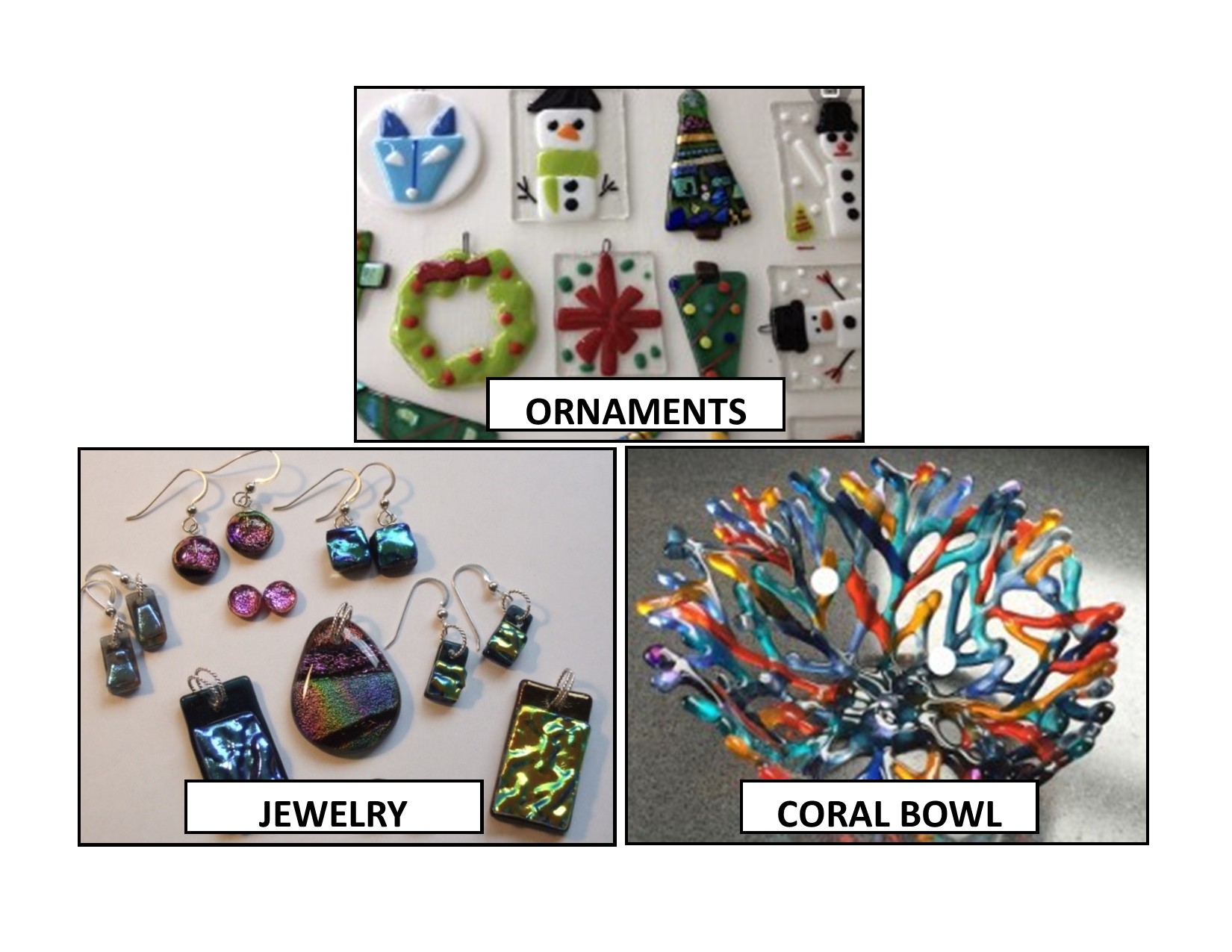 Instructor: Rosemarie Brown - Each student will complete several ornaments using the technique of fusing glass. No experience needed. Use of tools and all materials included